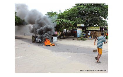 Des pneus brûlés le 19/01/2015 par des manifestants à Kinshasa qui répondaient au mot d’ordre de l’opposition congolaise de manifester contre l’adoption de la loi électorale au parlement. Radio Okapi/Ph. John Bompengo
