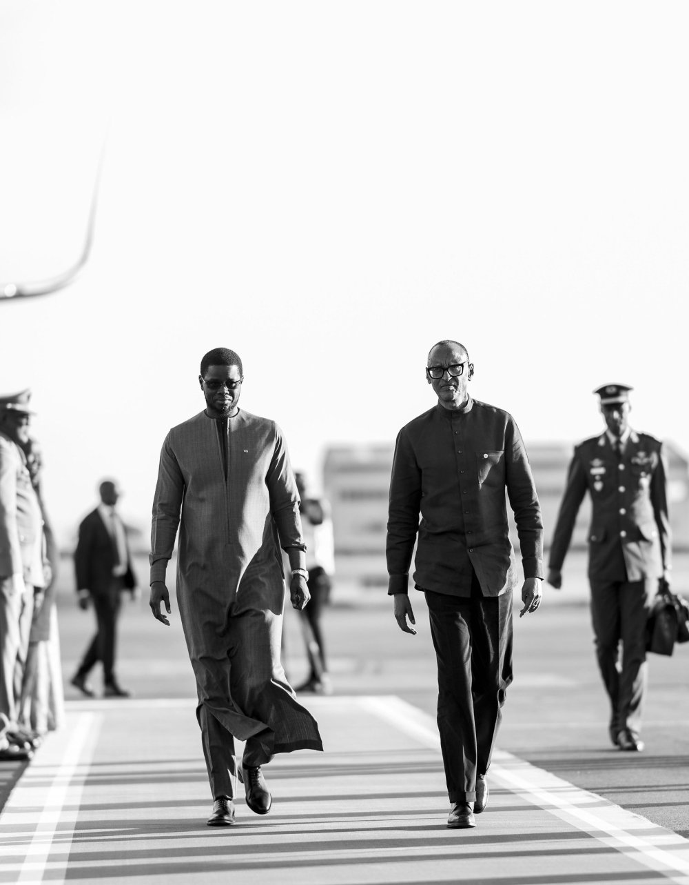 À son arrivée à l’aéroport international de Kigali, le chef de l’État sénégalais a été accueilli par le Président Paul Kagame, entouré de plusieurs hauts responsables gouvernementaux, dont des membres du cabinet ministériel.