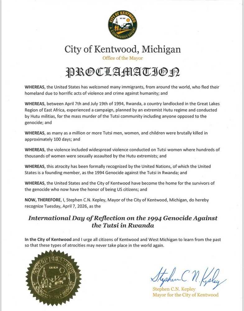 Reconnu par les Nations unies comme le génocide contre les Tutsi, cet événement reste l’un des chapitres les plus dévastateurs de l’histoire moderne. La proclamation souligne également le fait que les États-Unis, et plus particulièrement la ville de Kentwood, soient devenus le foyer de survivants ayant pu reconstruire leur vie en tant que citoyens américains.