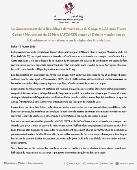 Le ministère qatari a également annoncé que le gouvernement de la RDC et l’alliance AFC/M23 ont signé un mandat définissant les grandes lignes des questions à aborder dans le dialogue, ainsi que les modalités de leur examen, conformément au cadre approuvé par la CIRGL.
